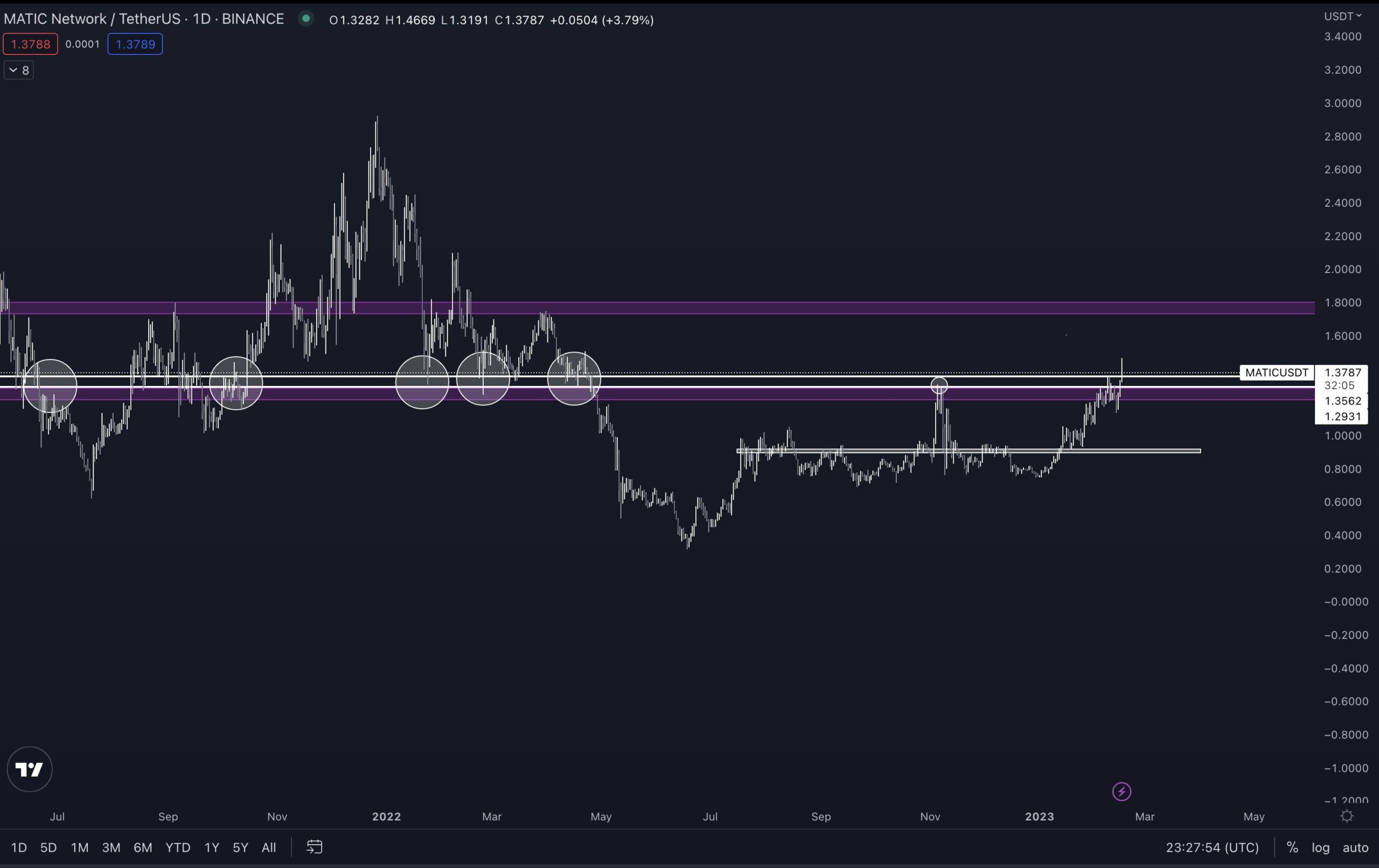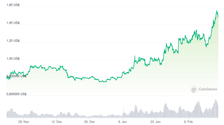 El precio de MATIC inició el año cotizando en el rango de los 0.75 dólares. Desde entonces, el precio del token de Polygon ha experimentado un aumento importante, casi duplicando su valor.