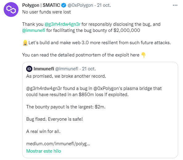 Después de 30 minutos, Polygon confirmó el error e inmediatamente comenzó a solucionar el problema subyacente. En este sentido, Polygon decidió parar la suma de 2 millones de dólares al hacker de sombrero blanco por la importante detección del bug.