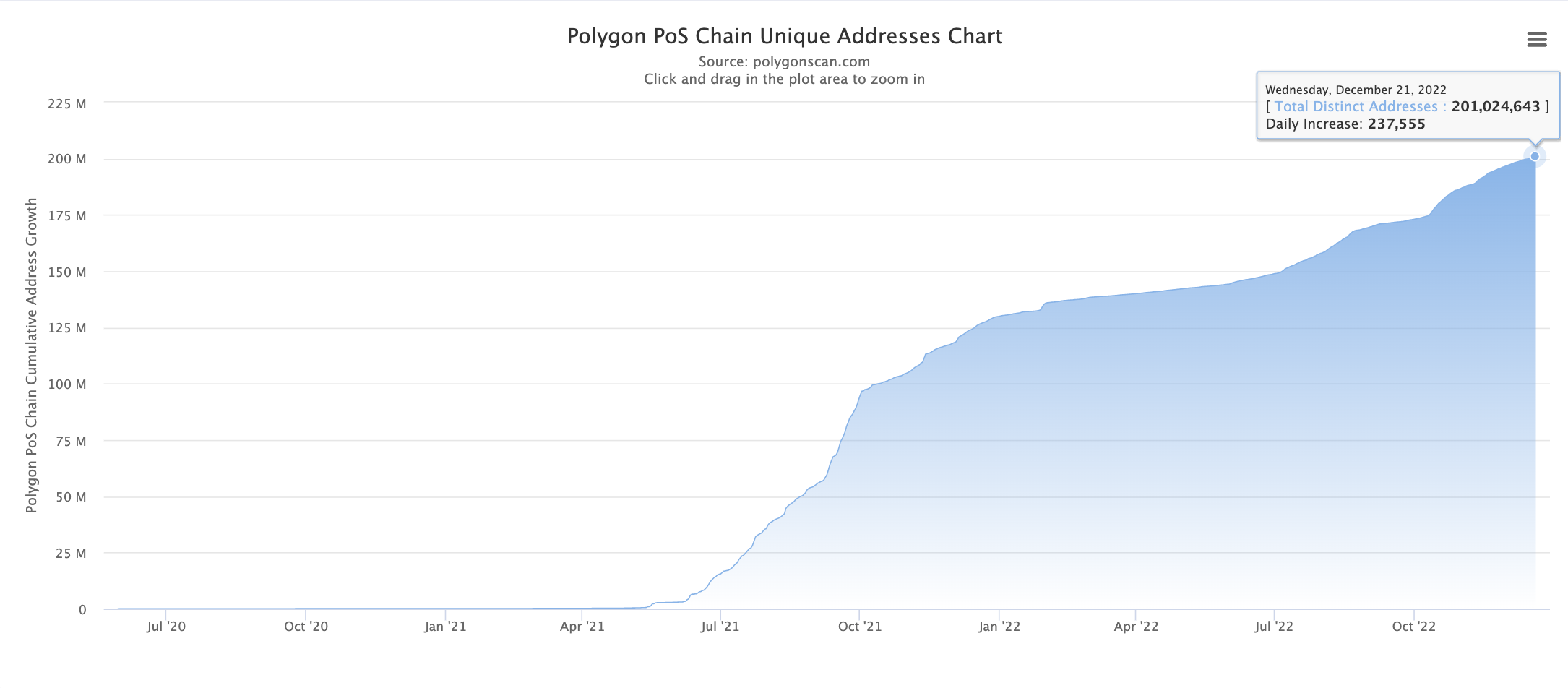 Datos de PolygonScan muestran que las direcciones únicas hasta el 22 de diciembre superan las 201,024 millones, mientras que en julio pasado la cifra era de apenas 15 millones 515 mil direcciones, mostrando que el crecimiento promedio diario de direcciones es de 250 mil.