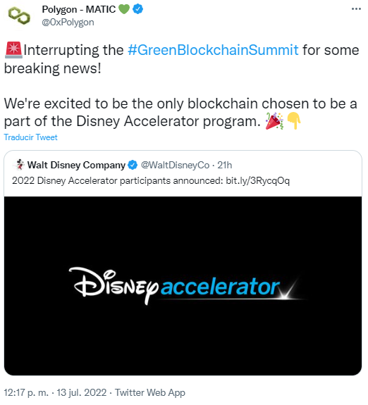 Polygon ha sido anunciado entre las empresas que participarán en el programa Disney Accelerator 2022. La noticia disparó el precio del token MATIC en un 25%.