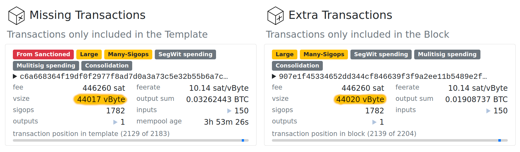 Sobre las 4 transacciones restantes, el investigador concluye que fueron ignoradas por F2Pool, el tercer grupo de minería más grande de Bitcoin.