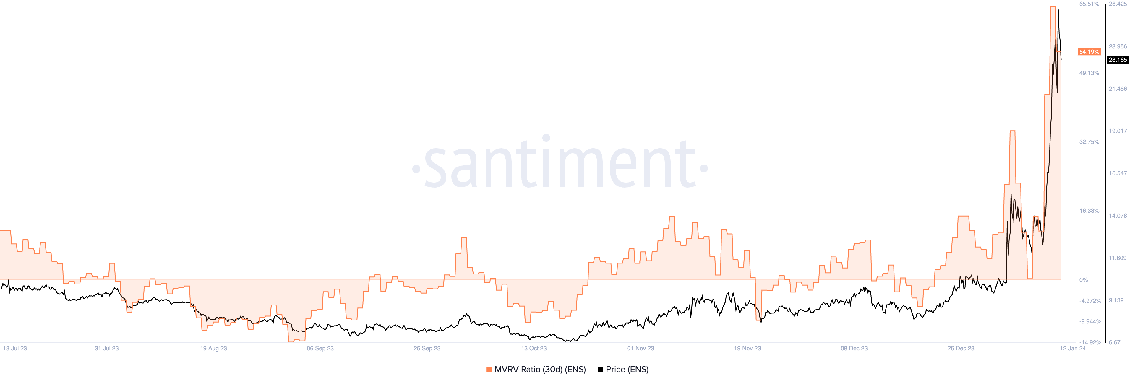 1- Ethereum Name Service (ENS): presenta un MVRV a 30 días del 54.19%.