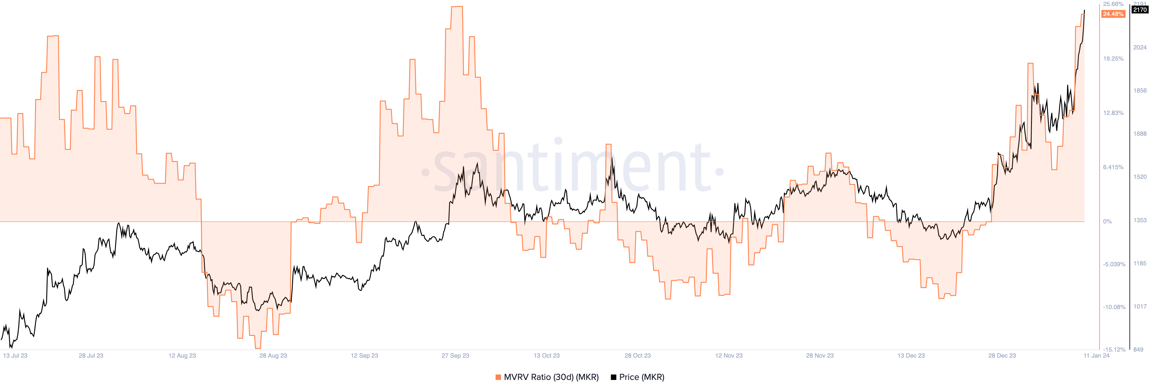 4- Maker (MKR): señala un MVRV a 30 días del 24.48%.
