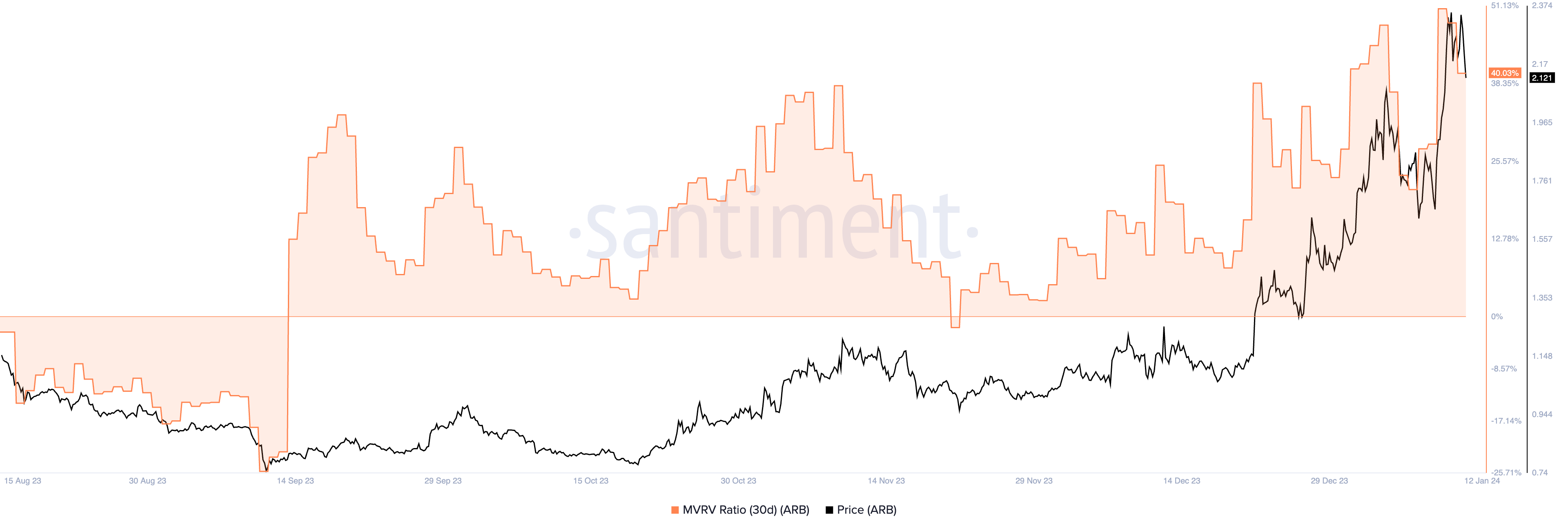 2- Arbitrum (ARB): presenta un MVRV a 30 días del 40.03%.