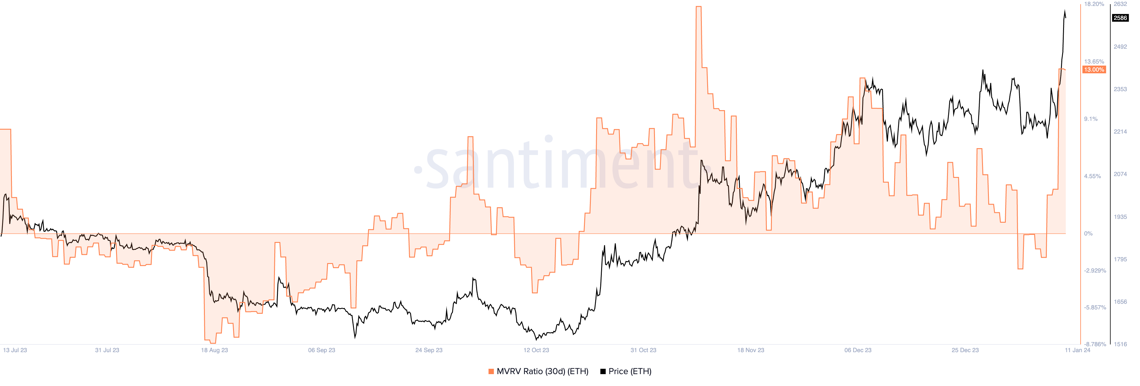 5- Ethereum (ETH): negocia con un MVRV a 30 días del 13.02%.