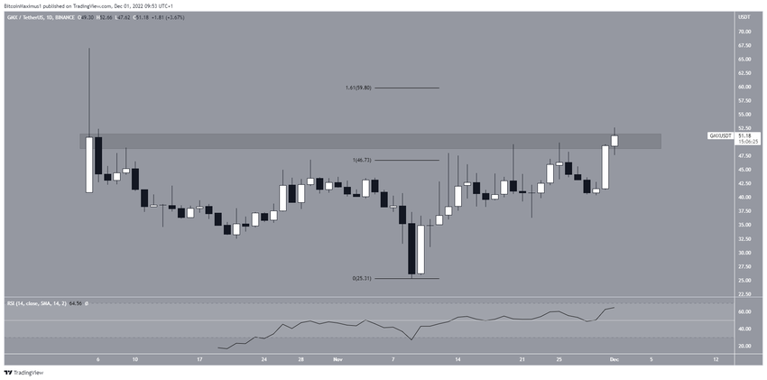 El precio de GMX fue el mayor ganador del mercado cripto el 30 de noviembre, con un aumento del 19%. Actualmente se cotiza dentro del área de resistencia de 50 dólares.