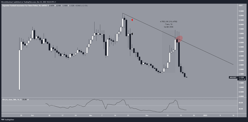 Sin embargo, a pesar de que Argentina y Lionel Messi se coronaron campeones del mundo el 18 de diciembre, el precio del fan tokenARG se desplomó poco después, validando la pendiente de la línea de resistencia (círculo rojo). Esto probablemente ocurrió cuando los holders de fan tokens cobraron, y también provocó que el RSI diario cayera por debajo de 50, una señal de una tendencia bajista.
