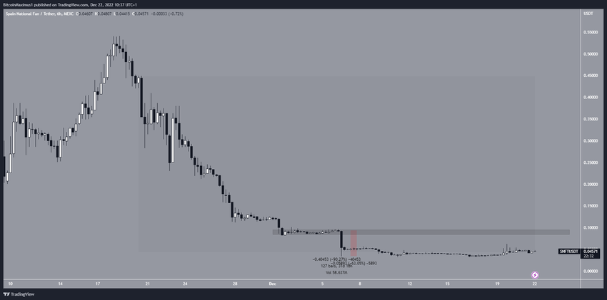 Si bien SNFT comenzó un movimiento alcista el 19 de diciembre, se cotiza muy por debajo del área de resistencia de 0.09 dólares. Como resultado, la tendencia es bajista hasta que se recupere esta zona y es probable que se produzcan nuevos mínimos históricos.