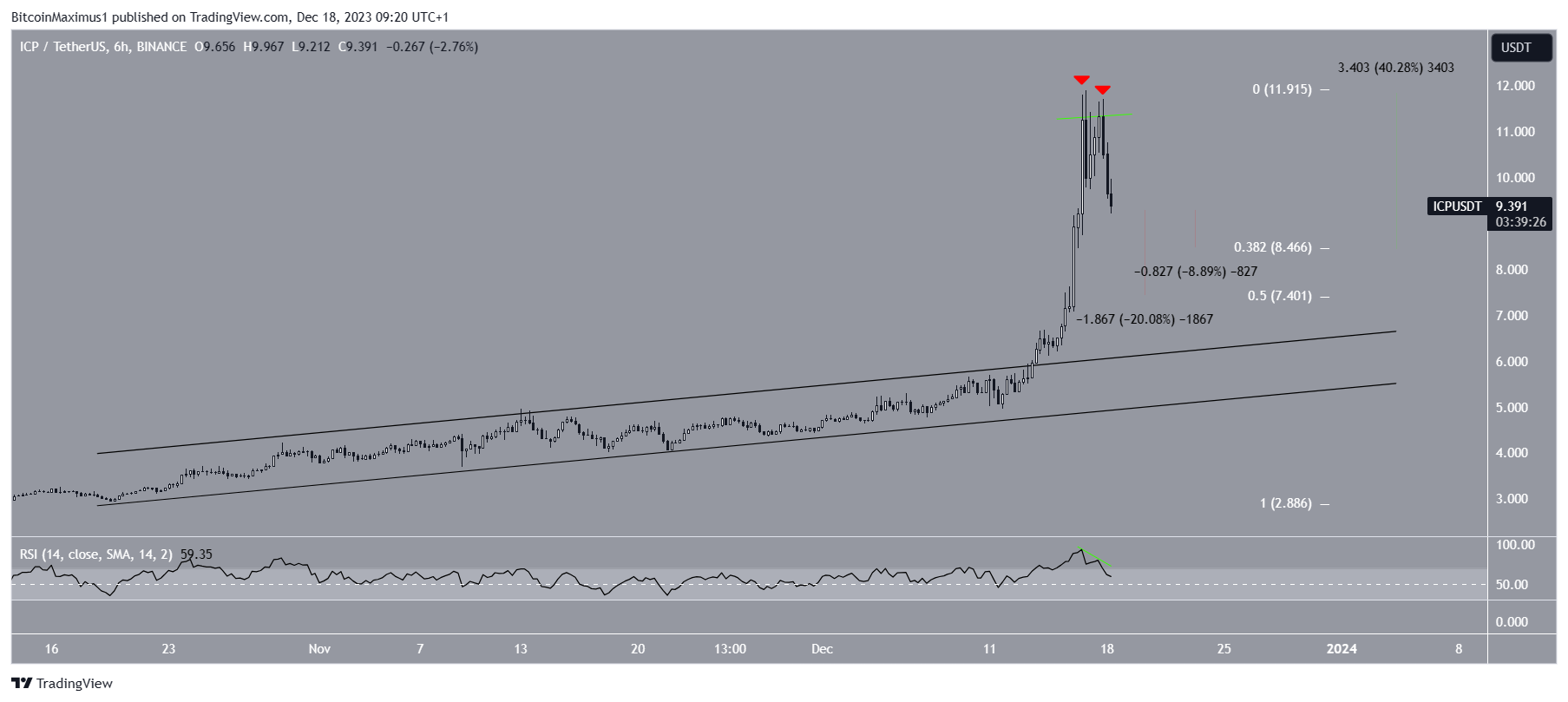 A pesar de esta predicción bajista del precio de ICP, un fuerte rebote en el soporte de 0,382 puede desencadenar un aumento del 40% hasta el máximo anual de 11.90 dólares.