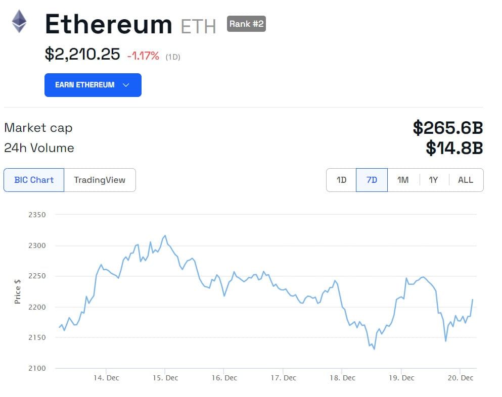 El precio de ETH ha retrocedido un 1.3% en el día a medida que los mercados se enfrían. Como resultado, el activo ha retrocedido a 2,210 dólares en el momento de escribir este artículo.