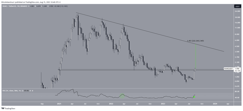 Como resultado del aumento, RUNE rompió una línea de resistencia descendente a largo plazo el 12 de agosto. El precio ahora se acerca al área de 1.70 dólares, que es la resistencia final antes de la región máxima anual de 1.95 dólares.