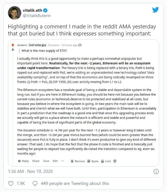 Buterin, junto con otros miembros del equipo de la Fundación Ethereum, intervino en una sesión de Reddit Ask Me Anything (AMA) el 17 de noviembre. Durante la sesión, también se reveló que el rediseño del contrato inteligente propuesto por Ethereum WebAssembly (eWASM) ha sido congelado.