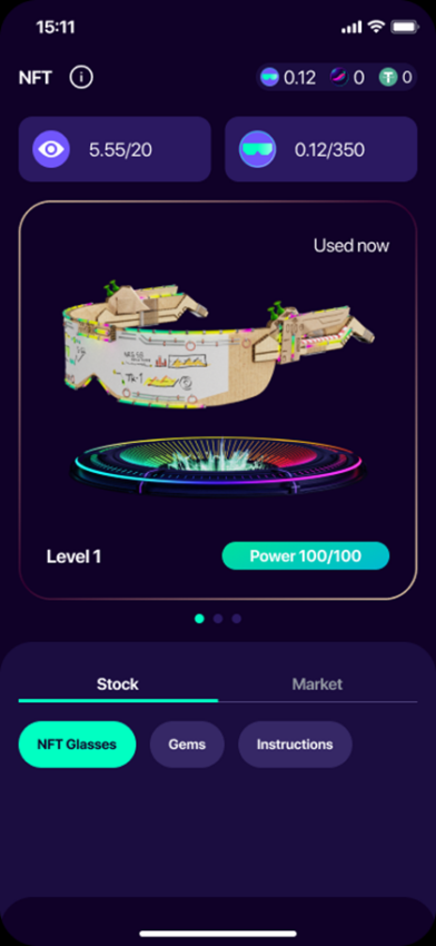 Ganar dinero en Cheelee requiere lentes NFT, que “uso” mientras veo videos. Voy a la pestaña “NFT” en la parte inferior de la pantalla principal, veo el cuadro Inicio, lo abro y reclamo mis gafas NFT de inicio. Bien, comencemos a ganar.