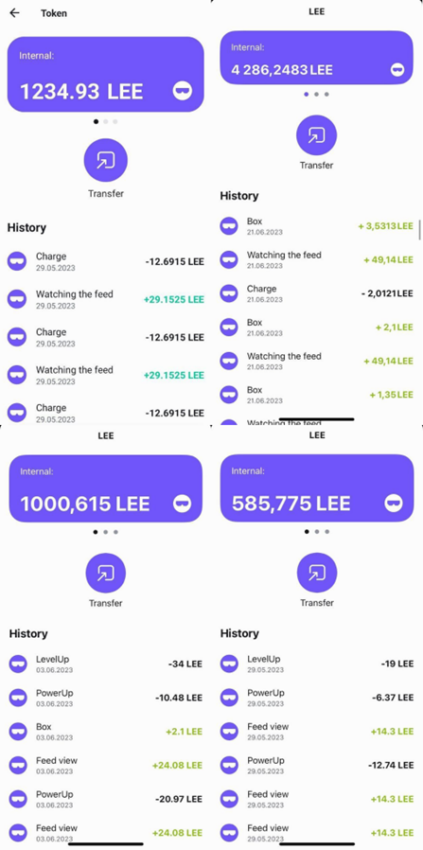 Es imposible retirar los tokens LEE obtenidos con las gafas de inicio, pero puede usarlos para actualizar sus NFT. LEE son tokens de utilidad que la aplicación cobra por las vistas. Puede ver el precio del token en CMC; hoy es 2.62. A continuación se muestra cuánto gané en el modo gratuito.