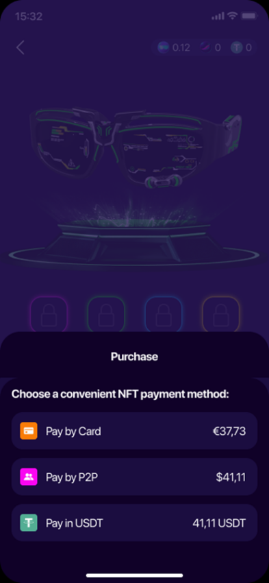 Compré las gafas raras yendo a la pestaña marketplace en la sección NFT. Su precio es de 463,5 USDT, y Cheelee permite comprarlos con tarjeta bancaria.