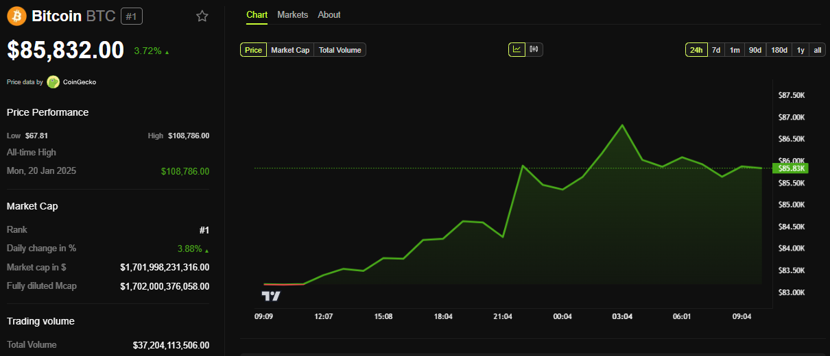Los datos de BeInCrypto muestran que BTC se negociaba a 85,832 dólares al momento de la publicación. Esto representa una ganancia modesta de casi 4% en las últimas 24 horas.