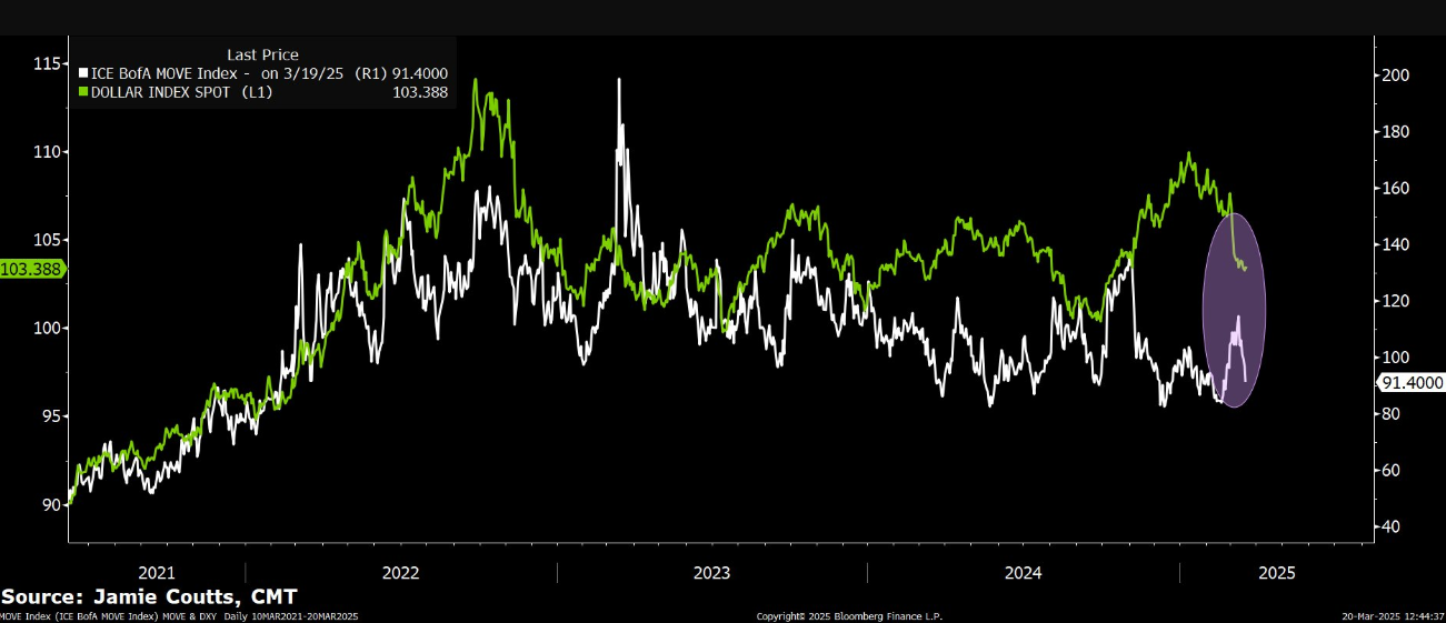 “Después de anoche, el QT está efectivamente muerto (por algún tiempo). La volatilidad del Tesoro ha retrocedido y ahora está reflejando la caída del DXY desde principios de este mes. Todo esto es extremadamente positivo para la liquidez”, señaló Coutts.