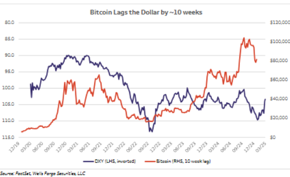 Señala que Bitcoin históricamente ha seguido un DXY invertido con un retraso de 10 semanas. Esto sugiere que la actual caída en los precios de BTC podría ser una reacción tardía al dólar fuerte a finales de 2024.