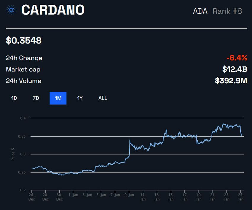ADA alcanzó un máximo de once semanas de 0.384 dólares el 22 de enero, pero hoy ha caído junto al resto del criptomercado. Actualmente cotiza en 0.354 dólares tras caer fuertemente en las últimas seis horas.