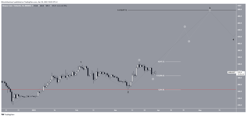 Si el recuento es correcto, la tasa de aumento de BNB pronto se acelerará bruscamente. Un objetivo potencial para la parte superior de la onda está en 498 dólares, encontrado por el nivel de resistencia de retroceso de Fibonacci de 0.618 de toda la caída desde el máximo histórico.