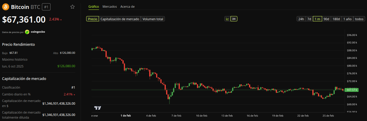 Actualmente, Bitcoin cotiza alrededor de 67,300 dólares tras haber experimentado una fuerte caída a comienzos de semana. El contexto es de liquidez reducida y sentimiento prudente. Para entender por qué el nivel de 90,000 dólares es decisivo, conviene analizar la estructura del mercado.