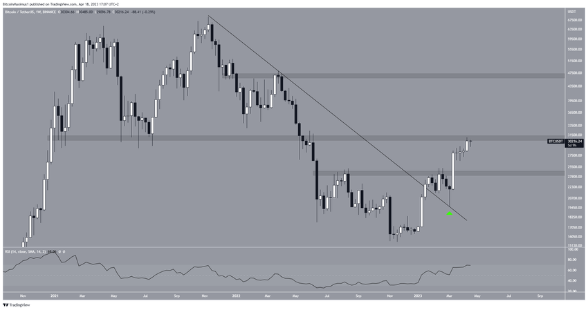 Posteriormente, BTC salió del área de resistencia de 24,500 dólares y ahora alcanzó la resistencia horizontal de 31,000 dólares. Esta es un área muy importante ya que anteriormente había actuado como soporte desde principios de 2021.