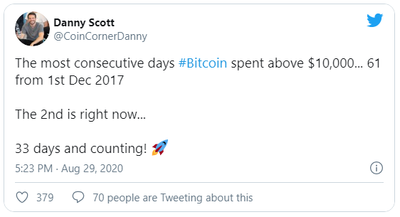 Scott de CoinCorner señala otra tendencia que brinda más apoyo al impulso alcista en el precio de Bitcoin. A pesar de que el pico de BTC está cerca de 20,000 dólares, el tramo más largo de la criptomoneda líder que cotiza por encima de 10,000 dólares fue de 61 días, a partir del 1 de diciembre de 2017. El segundo período más largo en el que el precio de BTC se mantuvo por encima de los 10,000 dólares es ahora, y es más que a mitad de camino para adelantar el tramo anterior.