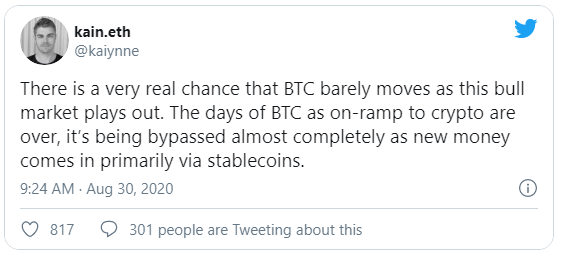 El usuario de Twitter kain.eth señaló que el aumento de las stablecoins amenaza con interrumpir el dominio de Bitcoin en el ciclo del mercado alcista. Los inversores ya no necesitan confiar en BTC como una “vía de acceso a las criptomonedas”, gracias a una gran cantidad de stablecoins como Tether, Circle’s USDC y Gemini dollar (GUSD).