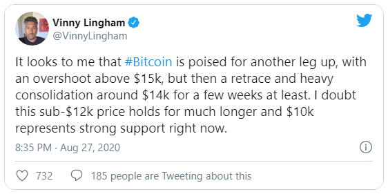 En los últimos días, Vinny Lingham, fundador de Civic, una startup de identidad impulsada por blockchain, ofreció su inusual evaluación de hacia dónde se dirige el precio de BTC, expresando dudas de que “el precio por debajo de los 12 mil dólares se mantenga durante mucho más tiempo”. Si es cierto, esto significa que Bitcoin podría estar en camino de superar la tendencia de 2017 por encima de los 10 mil dólares.