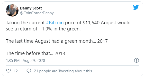 Danny Scott, CEO de CoinCorner, el exchangede BTC del Reino Unido, señaló en un tweet la importancia de las ganancias de este mes (hasta ahora), recordando a la comunidad de cripto que las dos últimas ocasiones en las que agosto demostró ser un “mes verde” para bitcoin: 2017 y 2013, pasaron grandes cosas.