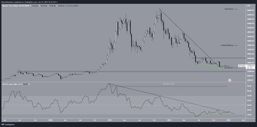 El precio de BTC ha caído por debajo de una línea de resistencia descendente desde su precio máximo histórico de 69,000 dólares en noviembre de 2021. El movimiento a la baja llevó a un mínimo de 15,632 dólares en noviembre de 2022.