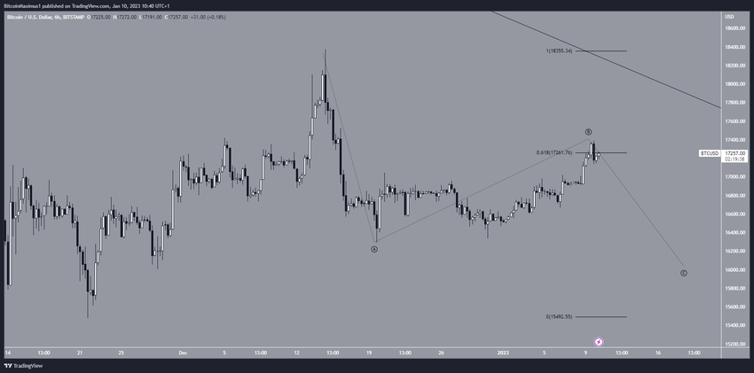 Actualmente, el precio de BTC se encuentra en la resistencia de retroceso de Fibonacci de 0.618 a 17,260 dólares. Si se rechaza desde este nivel, podría caer y completar la onda C.