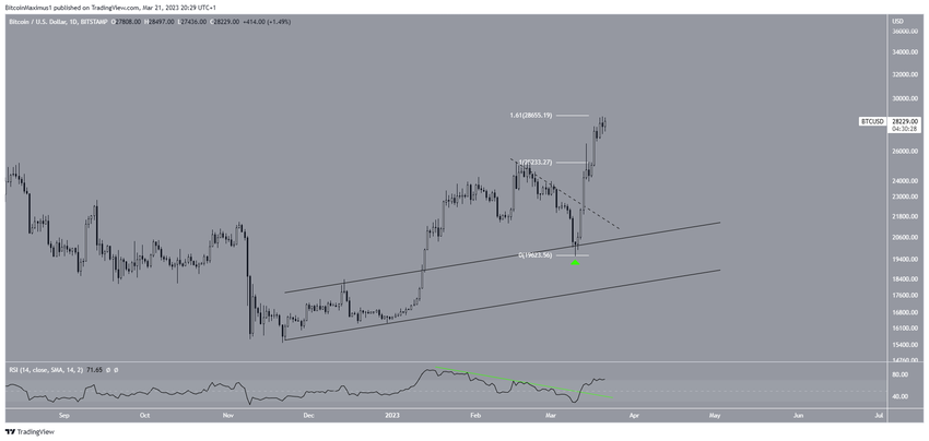 El gráfico diario de BTC muestra que el precio ha aumentado desde el 10 de marzo, cuando alcanzó un mínimo de 19,569 dólares (icono verde).