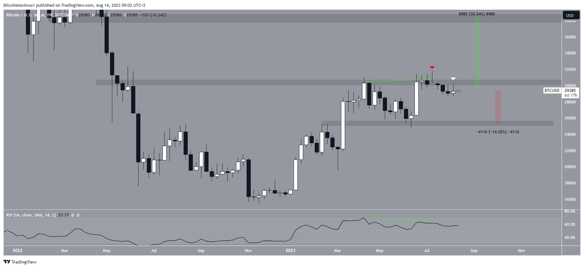 El análisis técnico del marco de tiempo semanal para BTC proporciona una perspectiva bajista. La razón principal de esto es el rechazo del área de resistencia de 30,500 dólares y la posterior caída (icono rojo). El rechazo también creó una mecha superior larga, considerada una señal de presión de venta.