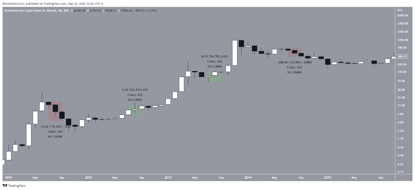 En 2011, el precio cayó en un enorme 74.29%. Dado que el máximo histórico de entonces se alcanzó en junio, el movimiento a la baja comenzó el mes siguiente y fue extremadamente agudo.