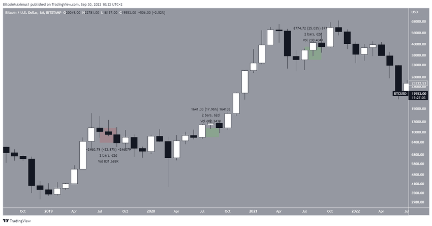 Para continuar con la tendencia, BTC registró un desempeño mixto en el tercer trimestre de cada año entre 2018 y 2021. El aumento de precio cayó un 23% en 2019, aumentó un 18% en 2020 y un 25% en 2021.