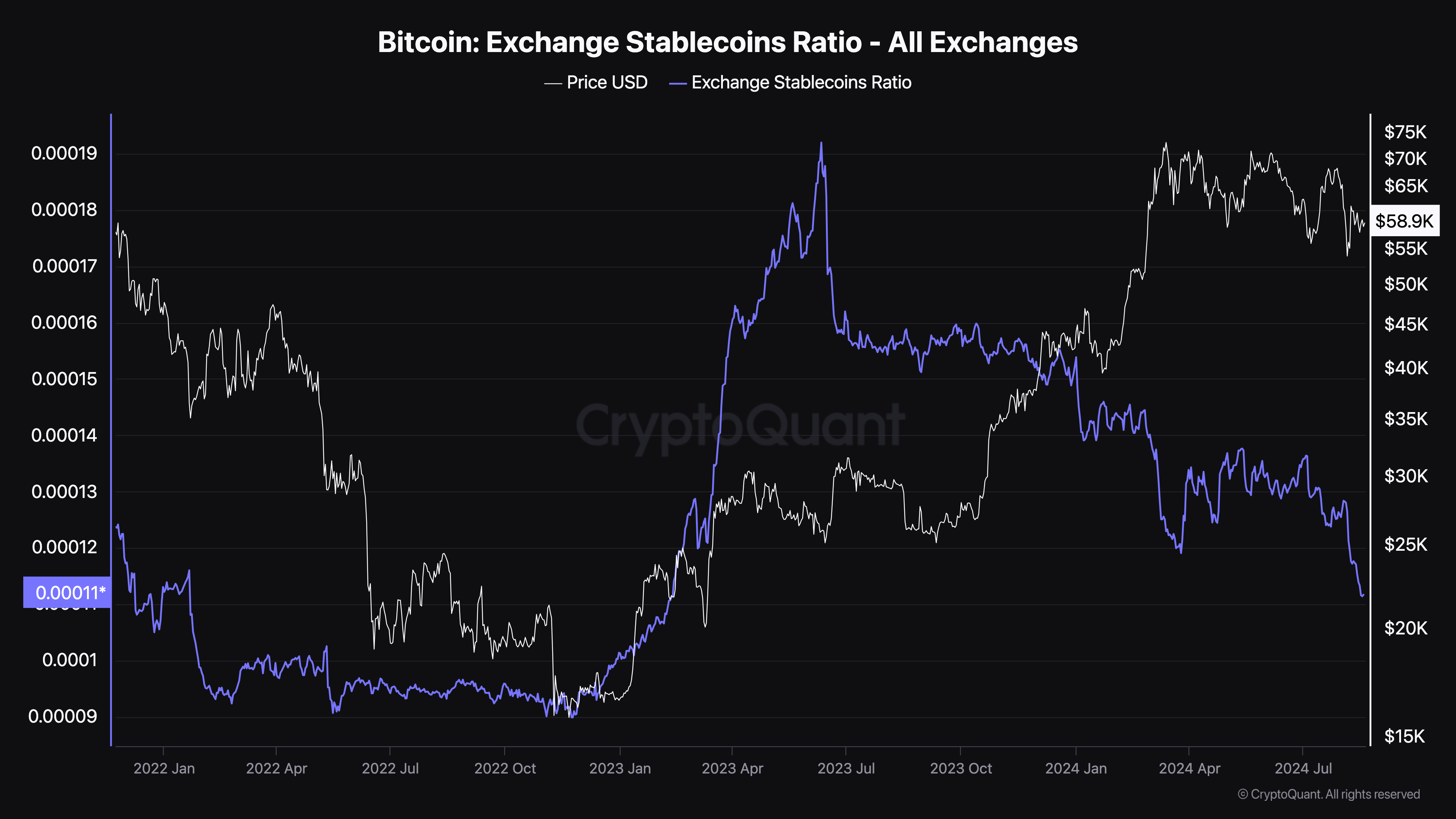 Otra métrica que apoya esto es Exchange Stablecoin Ratio, que mide el poder de compra en el mercado. Cuando la relación de stablecoins es alta, el poder de compra es bajo, indicando una mayor probabilidad de una caída de precios.