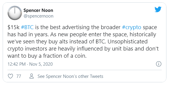 Spencer Noon de DTC Capital tuiteó que los nuevos participantes en el espacio cripto a menudo optarán por comprar altcoins en lugar de BTC en medio de una preferencia por poseer una moneda completa frente a hacer stacking de sats.