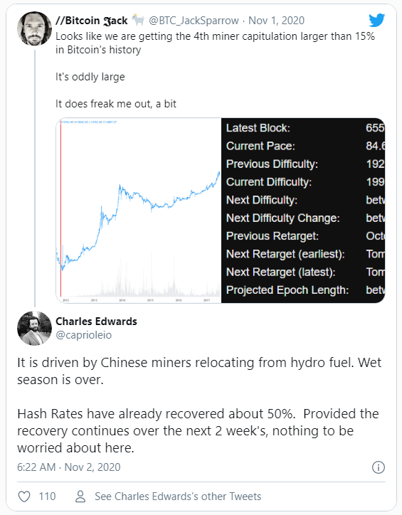 Sin embargo, según Charles Edwards de Capriole Investments, esas caídas de precios podrían explicarse por “los mineros chinos que se trasladan del combustible hidráulico”, y agregó que “la temporada de lluvias ha terminado”. Además, señaló que las tasas de hash se han “recuperado alrededor del 50%”.
