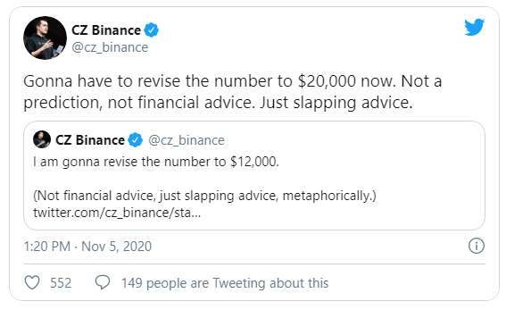 Mientras tanto, el CEO de Binance, Changpeng Zhao, aprovechó la oportunidad para elevar su perspectiva de precios de BTC, advirtiendo que Bitcoin ahora se está acercando a los 20,000 dólares, donde superaría su máximo histórico establecido a finales de 2017.