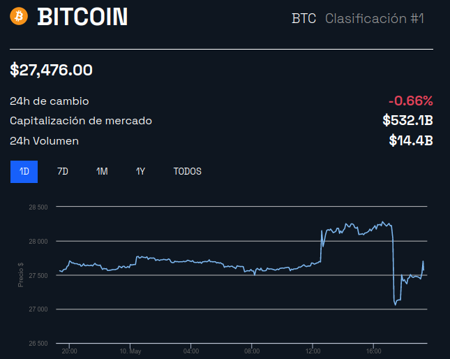 Al momento de la publicación, el precio de Bitcoin se ha recuperado levemente y cotiza sobre los 27,700 dólares.