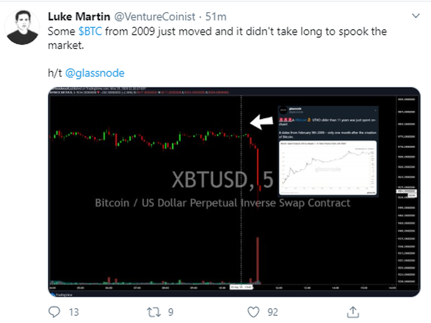 Como señaló el trader y observador de la industria Luke Martin, el gráfico de un minuto muestra una clara caída en el precio desde el momento en que WhalePanda reportó por primera vez las monedas en movimiento.