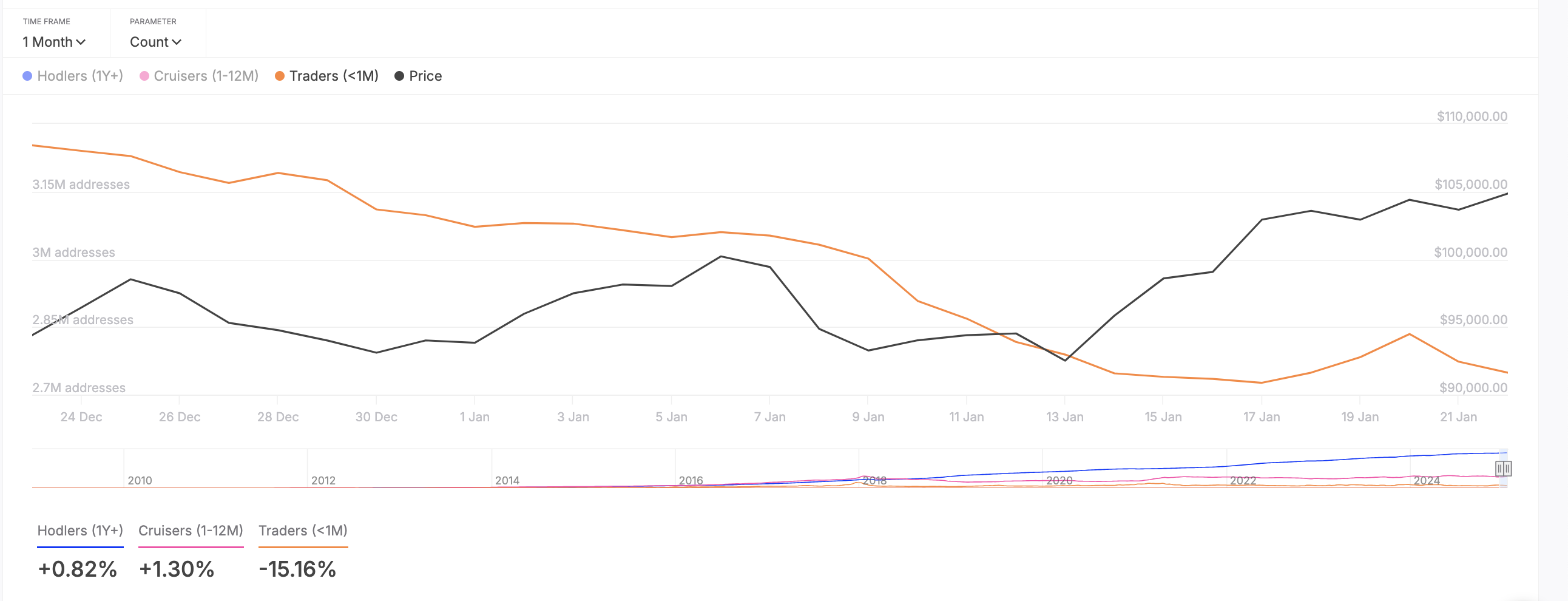 Esta caída en la actividad minorista es notable dada la alta volatilidad actual de Bitcoin. Típicamente, períodos de grandes oscilaciones de precio como este van acompañados de un aumento en la actividad on-chain, ya que los inversores minoristas buscan comprar en las caídas o tomar ganancias durante movimientos al alza.