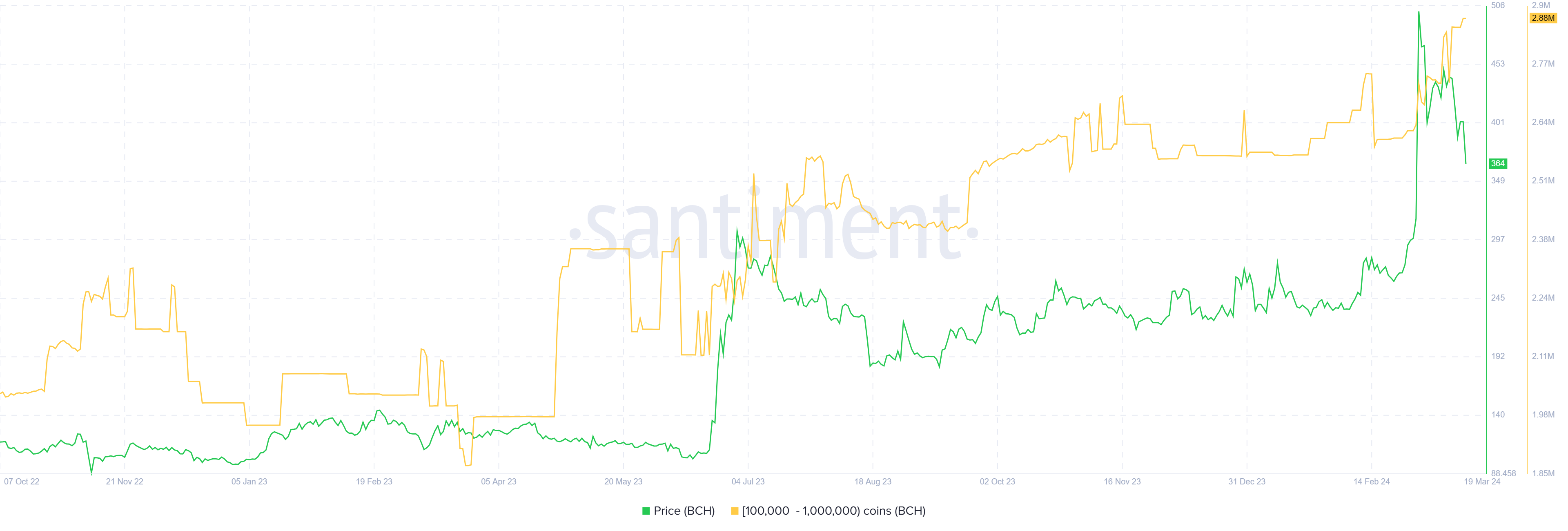 Las direcciones que tienen entre 100,000 y 1 millón de BCH, en particular, han estado añadiendo tokens a sus monederos. En el lapso de una semana, sus holdings han subido de 2,77 millones de BCH a 2,88 millones de BCH.