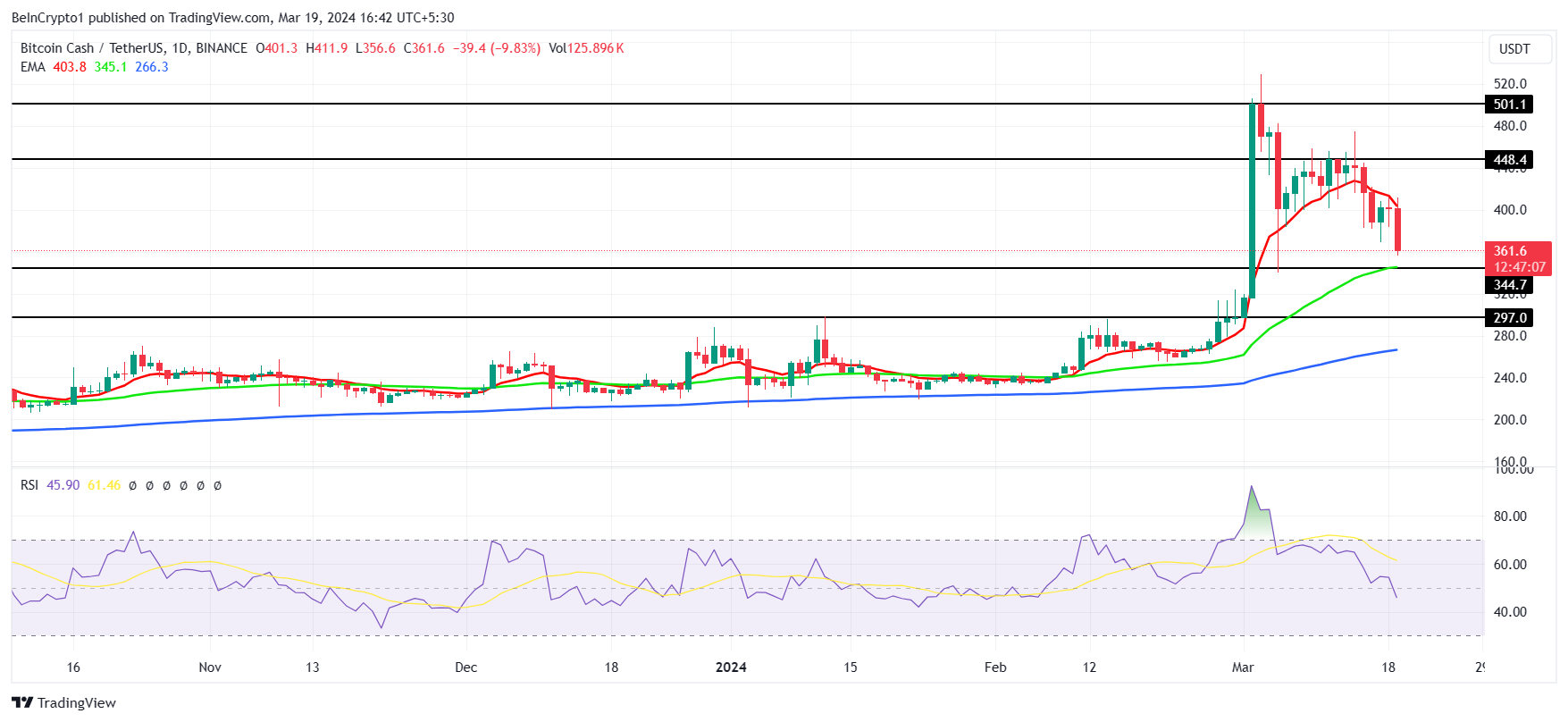 Bitcoin Cash (BCH) está marcando un descenso significativo tras cruzar la marca de 500 dólares a principios de este mes. La corrección de un solo día ha superado el 10%.