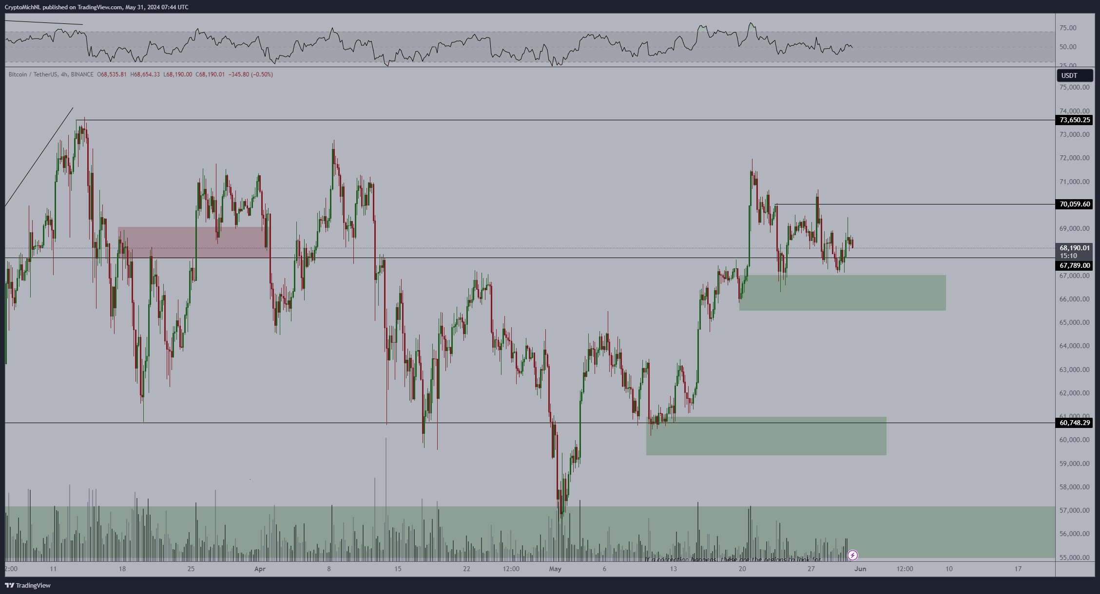 Según Keith Alan, cofundador del recurso comercial Material Indicators, si Bitcoin no logra superar este nivel de resistencia en el cierre mensual de mayo, es probable que continúe consolidándose en el rango actual. Alan destaca la importancia de convertir 69,000 dólares en soporte, afirmando que “un cierre mensual por encima o por debajo de 69,000 dólares nos dirá si estamos construyendo el siguiente tramo o si vamos a seguir consolidándonos en este rango”.