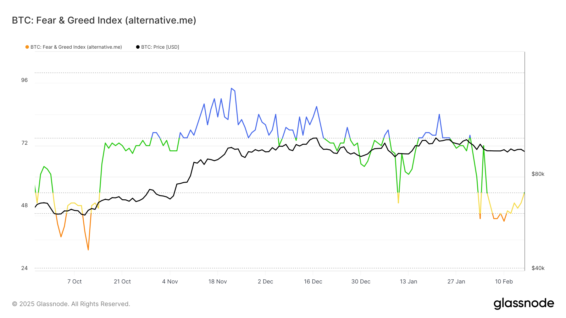 El impulso más amplio del mercado de Bitcoin está mostrando señales mixtas, con el Índice de Miedo y Codicia acercándose a la zona de “Codicia”. El índice, que rastrea el sentimiento del mercado, está a punto de pasar de Neutral a Codicia, lo que a menudo indica que el mercado puede estar acercándose a máximos locales.