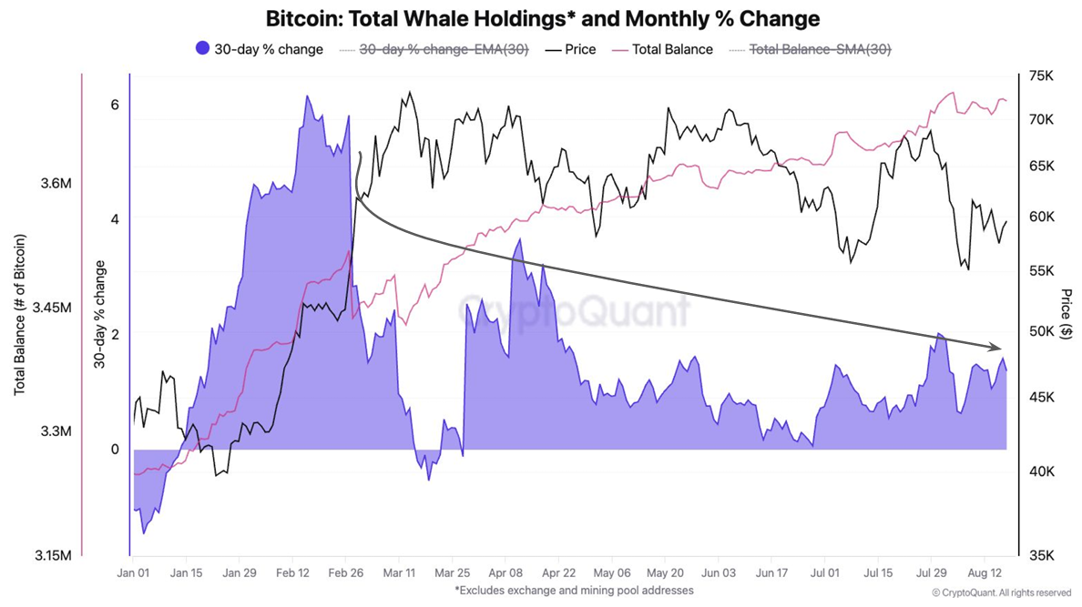 Un informe exclusivo de CryptoQuant compartido con BeInCrypto muestra que las tenencias de los grandes holders de BTC han disminuido considerablemente. Como se señala en el informe, el cambio porcentual de 30 días en los holdings de las ballenas ha disminuido del 6% en febrero a solo el 1% en la actualidadd.