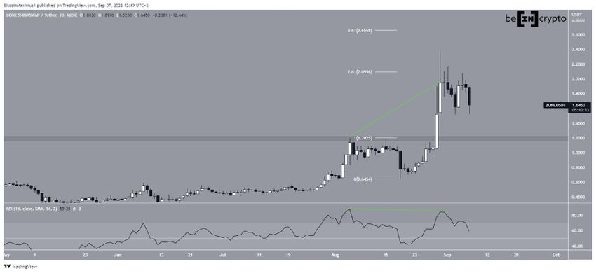 El precio de Bone ShibaSwap (BONE) ha estado cayendo desde el 30 de agosto y podría continuar su descenso hasta alcanzar el área de soporte horizontal de 1.20 dólares.