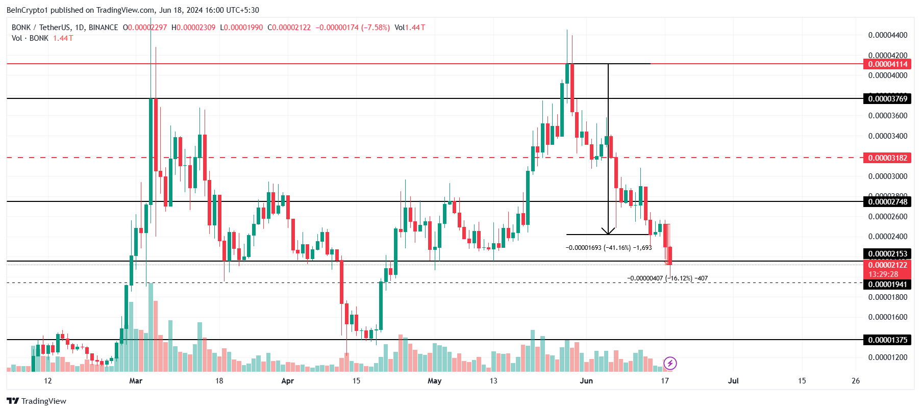 El precio de trading de BONK a 0.00002122 dólares ya está por debajo del soporte crucial de 0.00002153 dólares. Si continúa la caída, la altcoin tiene solo una oportunidad de rebotar desde 0.00001941 dólares.